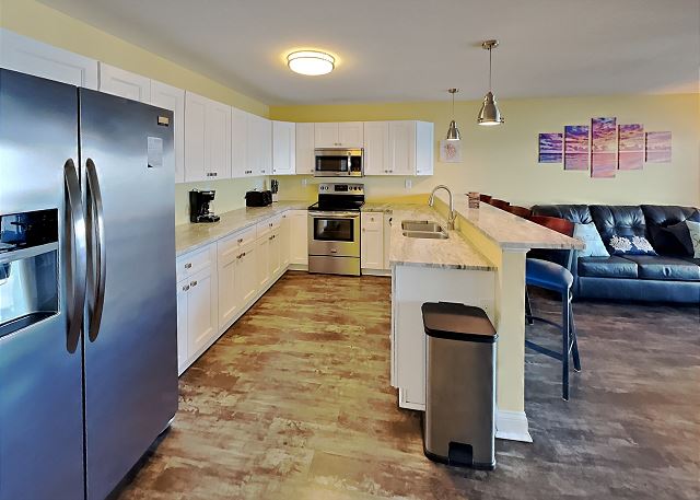 This lower level unit has one bedroom with 2 queen beds, a modern full bath, a large lakeside deck, and has a capacity of up to six guests using the pullout sofa sleeper. Guests gain access to the condo through a coded door lock. This is very convenient as keys are eliminated from the equation. The fully equipped kitchen comes capable of satisfying the cook of your group. Whip up a hearty breakfast or delectable dinner, all while saving some money during your Put-in-Bay vacation. With a location that cannot be beat and beautiful new accommodations, the time is now to book your excursion. We sell out on many dates, so booking early will ensure that your dates are available. The weekends at Put in Bay Ohio are popular for the nightlife and getting away from the daily work grind without going too far from home. During the week, you can relax and enjoy Put-In-Bay's slower pace in a family friendly atmosphere. With Island Club Rentals, you can visit Put-in-Bay and enjoy your own home or condo and you can even rent a golf cart onsite to get around. Please let us know how we can make your vacation at Put-in-Bay a great one! Cable TV, HBO, and high speed internet are complimentary.